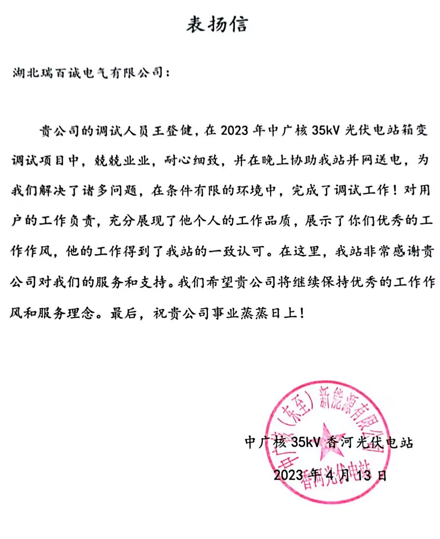 貴公司的調(diào)試人員王登健,在2023年中廣核35kV光伏電站箱變調(diào)試項(xiàng)目中,兢兢業(yè)業(yè),耐心細(xì)致,并在晚上協(xié)助我站并網(wǎng)送電,為我們解決了諸多問題,在條件有限的環(huán)境中,完成了調(diào)試工作!對(duì)用戶的工作負(fù)責(zé),充分展現(xiàn)了他個(gè)人的工作品質(zhì),展示了你們優(yōu)秀的工作作風(fēng),他的工作得到了我站的一致認(rèn)可。在這里,我站非常感謝貴公司對(duì)我們的服務(wù)和支持。我們希望貴公司將繼續(xù)保持優(yōu)秀的工作作風(fēng)和服務(wù)理念。最后,祝貴公司事業(yè)蒸蒸日上!